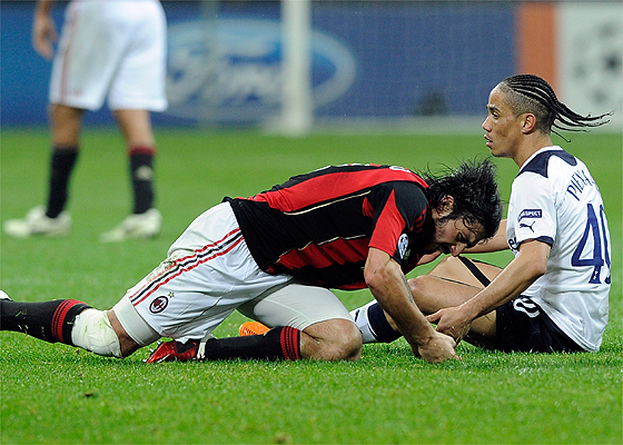 Joe Jordan, auxiliar do Tottenham, sofre com a fúria de Gattuso durante a partida. O volante italiano pediu desculpas após a partida pelo seu comportamento violento. Foto: Stefano Rellandini/Reuters
